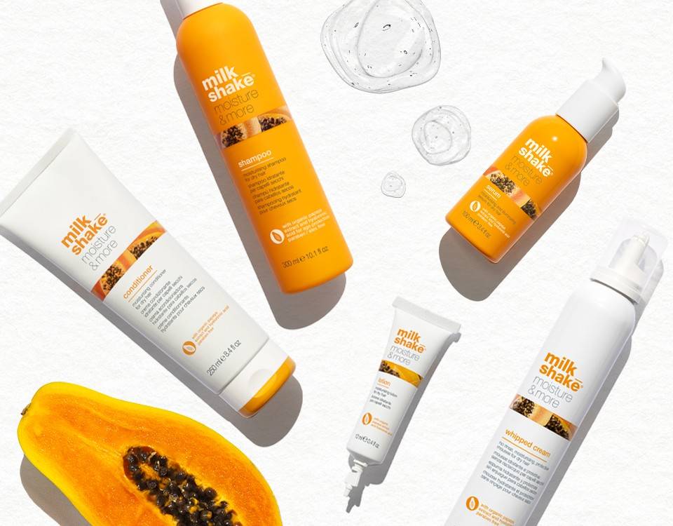 milk_shake® moisture & more es una línea que proporciona un equilibrio óptimo de hidratación a la vez que aporta la nutrición esencial para unos resultados brillantes y saludables. milk_shake® moisture & more está enriquecido con extracto de papaya orgánica y con un bajo peso molecular y dejan el cabello lustroso, brillante, bonito y radiante desde la primera aplicación. El kit tiene dos resultados en el cabello: máxima hidratación y un cabello visiblemente más joven.
